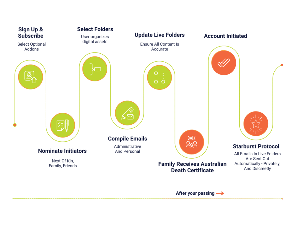 All emails are stored in live folders and get sent out automatically when the account has been initiated with a death certificate.